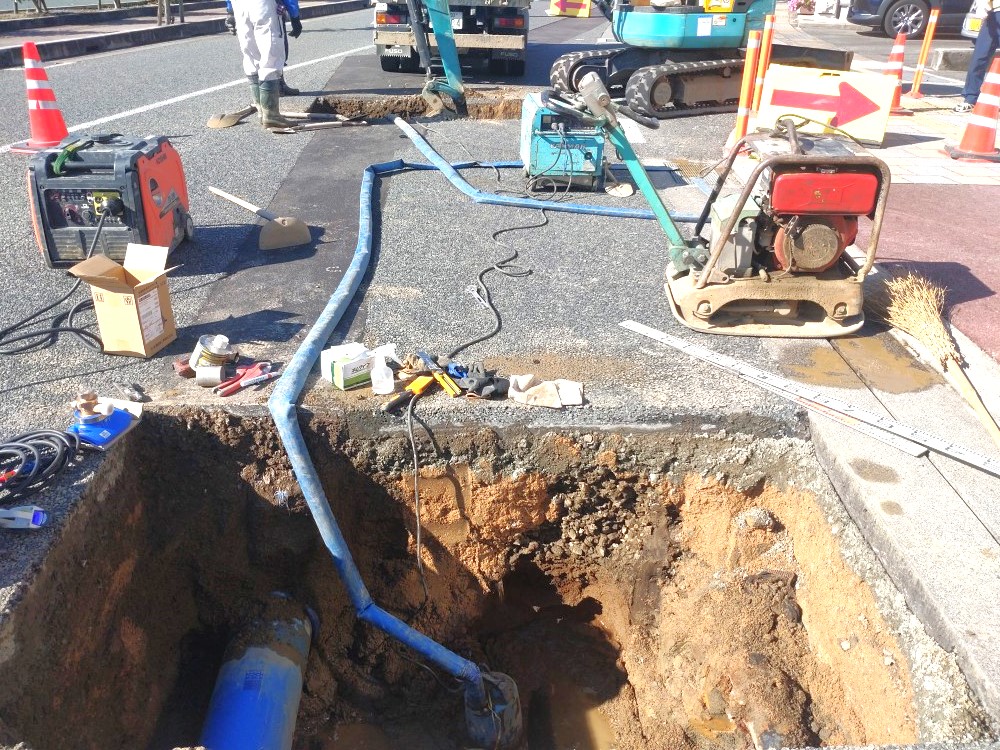 庄原市役所前の水道管布設替え工事になります。 古くなっていく水道管を新しい管に取り換える工事です。 わかりにくいですが、水道管が3本並んでいるのがわかりますか? 影で見えにくいんですが…(汗) 一番左側のブルーの管がこの度 布設する、200mmのHPPEという管でポリエチレンでできています。 メリットは耐久年数が長いんです。 鋳鉄管の倍です。 長いんです!