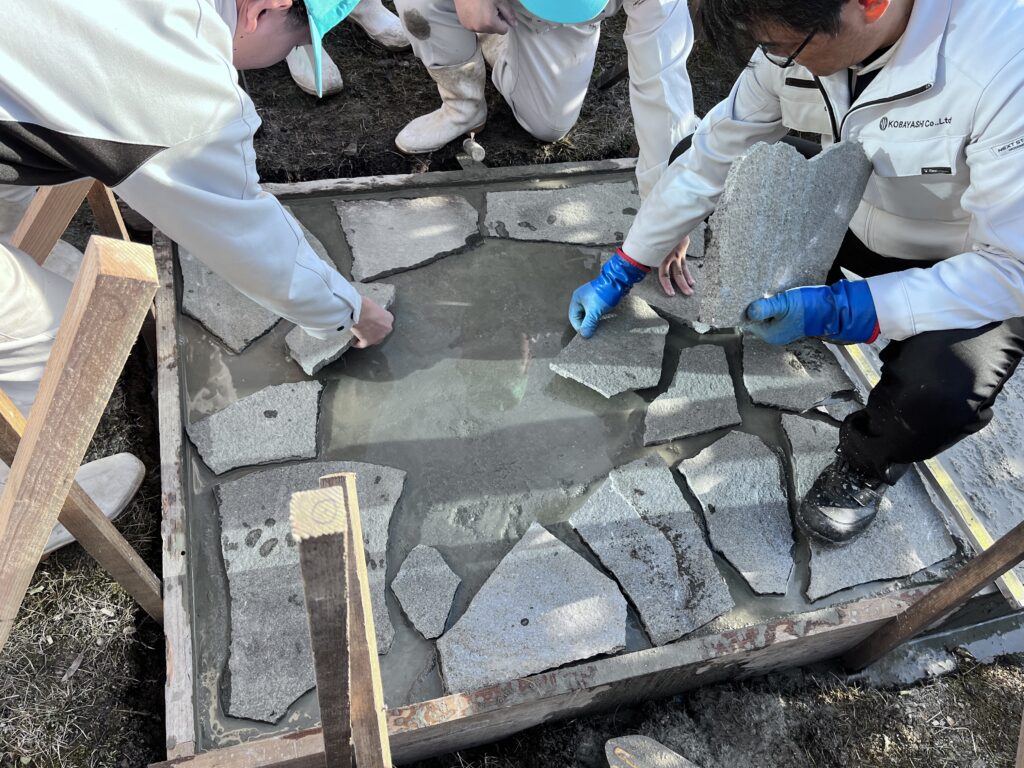 手練りモルタル打設・鉄平石張りと作業は流れるよう進みました。